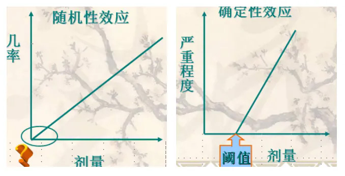 1.随机性效应:无剂量阈值有害效应的严重程度与受照剂量大小无关,任何微小的剂量也可引起效应,只是发生的几率极其微小而已。如:致癌效应(癌症 、白血病) ; 遗传效应(损伤发生在具有遗传信息的功能细胞上,发生的效应将显现在受照者的后代身上)。