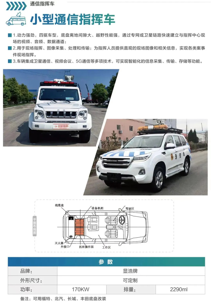 1.动力强劲,四驱车型,底盘离地间隙大、越野性能强,通过专网或卫星链路快速建立与指挥中心现场的视频、音频、数据通道;