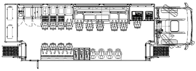 这种类型转播车常配备8~12讯道;作为4K转播车,导演区通常只能放6块大屏,且多为单侧拉,侧拉深度一般在1.2~1.5米。当然根据用户使用需求也有不带侧拉和双侧拉的,双侧拉时要留意超重的风险。