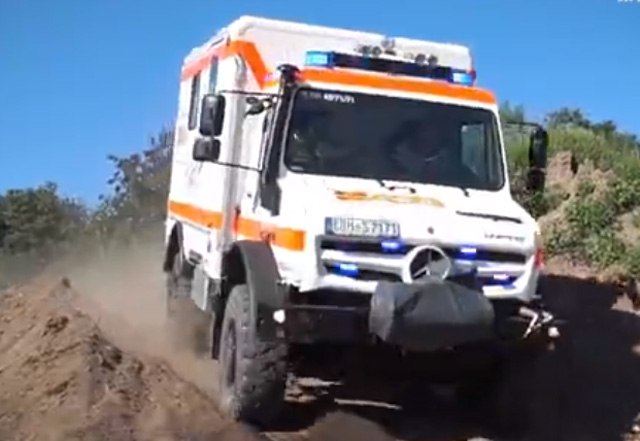 Mercedes Unimog U 4023,德国制造的坚固可靠的车辆。可以为偏远地区的人提供医疗服务,车辆长6米,总重量为10.3吨。配备了自恢复绞盘轮胎充气系统。发动机功率为231马力,最高时速是89公里每小时。可以穿越森林山脉等困难的地形。也可以穿越水深1.2米的区域。