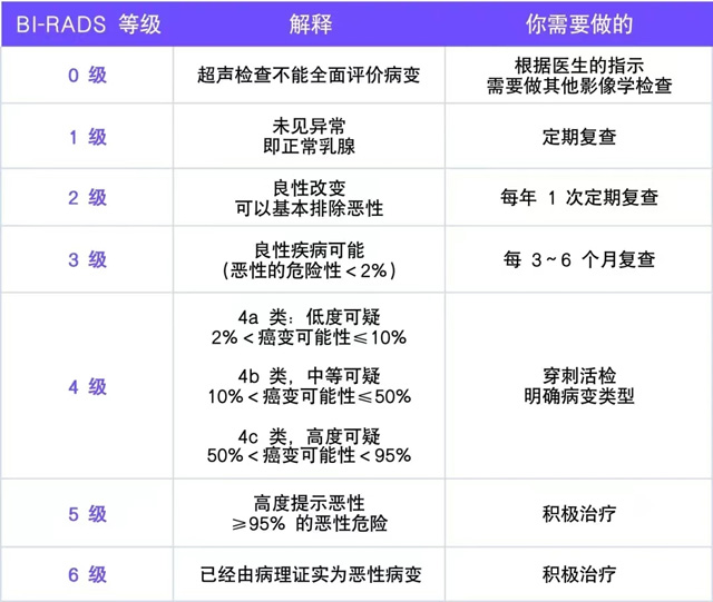 报告出现异常怎么办?根据乳腺超声结果,可分为以下6类: