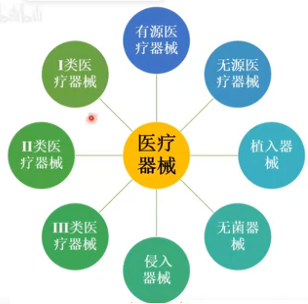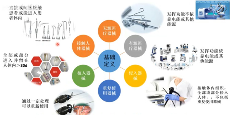 主要定义、风险程度、结构、接触人体、使用形式、医疗效果和使用时限。首先是医疗器械的基础定义,主要是根据医疗器械的机构和功能特点来进行划分的。无源医疗器械不依靠电能或者其他能源,通过人体使用,发挥其功能的医疗器械。没有动力源的医疗器械,有注射器,手术刀。有源医疗器械任何依靠电能或者其他能源,常见的有超声影像设备DR、CT、医疗机器人等。侵入器械,接触体内组织身体内部位的医疗器械。通过体表侵入人体介入手术使用的器材、一次性无菌手术器械暂时或者短期留在人体的医疗器械。侵入器械不包括重复使用的手术器械,我们常见的有,注射器和针头,胃肠镜、尿管、骨科耗材等。重复使用器械用于手术中进行切割钻锯抓刮钳抽夹等等过程。不连接任何有源医疗器械。通过一定的处理可以重新使用的无源医疗器械。常见的有:腹腔镜、喉镜、胃肠镜等。植入器械,借助手术全部或者部分进入体内或者腔道里面。或者用于替代人体上皮、眼表面,术后留在体内一个月以上的。被人体吸收的医疗器械。常见的有心脏起搏器、心脏支架、人工关节、脑起搏器、口腔种植等。接触人体器械:进入体内的医疗器械。医用注册器,手术到、内窥镜、起搏器。大部分属于接触人体医疗器械范畴的。