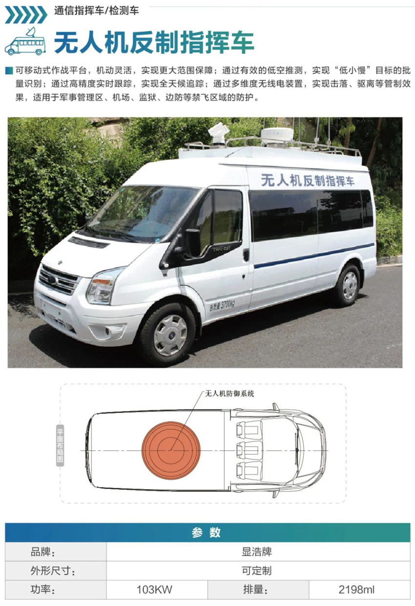 无人机反制车无线电干扰反制设备,是无人机防控领域的电磁干扰类反制设备。设备通过发射无线电信号,无人机反制车在特定区域形成电磁信号屏蔽,阻断无人机GPS导航、遥控、图传信号的接收,使无人机无法进入管控区域或者使其迫降。可用于油气库,化工园区,监狱,政府机关所在地等重点区域,也可用于大型活动保障,无人机反制车防止无人机入侵。是公安、治安部门针对重要赛事、突发事件、大型活动综合移动平台,是低空防御系统技术的综合运用。在对非法无人机进行反制过程当中,民警可以根据不同情况,对非法无人机进行快速有效准确打击 ,在空中领域发挥出奇制胜的作用。